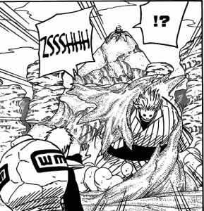 First an explanation as to what the technique really is. Evidently it involves creating a water clone that is surrounded by oil and according to Oonoki this makes changing it's temperature a very simple task; that means as the oil heats up, water vapour causes it to explode and the consequent hail cools it back down to it's original form so it can keep exploding. Now that is a terrifying technique and one worthy of it's name! And after Oonoki's explanation of it, the allied forces start searching for the Mizukage's real body whilst Gaara attempts to take out the clone.