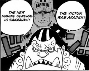 1. Aokiji duelled Akainu on an island as he was opposed to the idea of serving under him as fleet admiral (Akainu had the government's support i.e. the Gorosei) but lost! He was spared by Akainu but in disgust left the marines. New Fleet Admiral= Akainu.