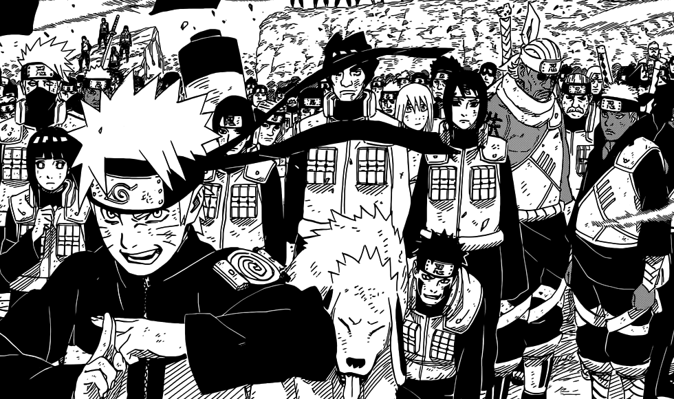 Gathering so many people together can only mean that we're nearing the end. No I'm not forgetting about Sasuke; this is the penultimate battle in some ways. It's because everyone has gathered that Naruto can focus on saving his fallen friend - lack of bigger picture sense from him - and put an end to the war.