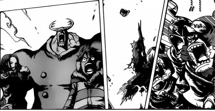 With this chapter it feels like the Punk Hazard chapter is wrapping up and not to sound negative at all but I am happy to see this happening. It might be just me, but the continued use of body swap humour has gone stale and even in this chapter where the comedy shifts to Smoker and Tashigi's interactions with Luffy, it just didn't feel as funny as the first few times. I did think that it was appropriate for Luffy to meet Smoker in his current state, due to me viewing their relationship as a type of Gold Roger and Garp rivalry (even more-so now that Smoker is a Vice-Admiral) so having Smoker and Luffy fight it out in Punk Hazard would be somewhat of a waste in the long run.