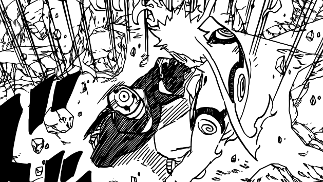 I must say that it was a little hard to follow at times, and with the numerous panels on certain pages it sometimes became difficult to know where to look but this chapter definitely did its job in kickstarting the fight between Naruto and Tobi. Tobi's mystery still keeps us in the dark about the extent of his powers and so the fight further clarifies his strength, adding onto the only other time we got a glimpse of his full strength in his fight against Konan but it also raises the question how Naruto is going to beat Tobi in the end; if he can't even beat him in his bijuu mode with the aid of Kakashi and Guy, how will he accomplish this feat Will we have to witness yet another power-up We did see Tobi render Kakashi's Mangekyou Sharingan useless and Gai could barely touching